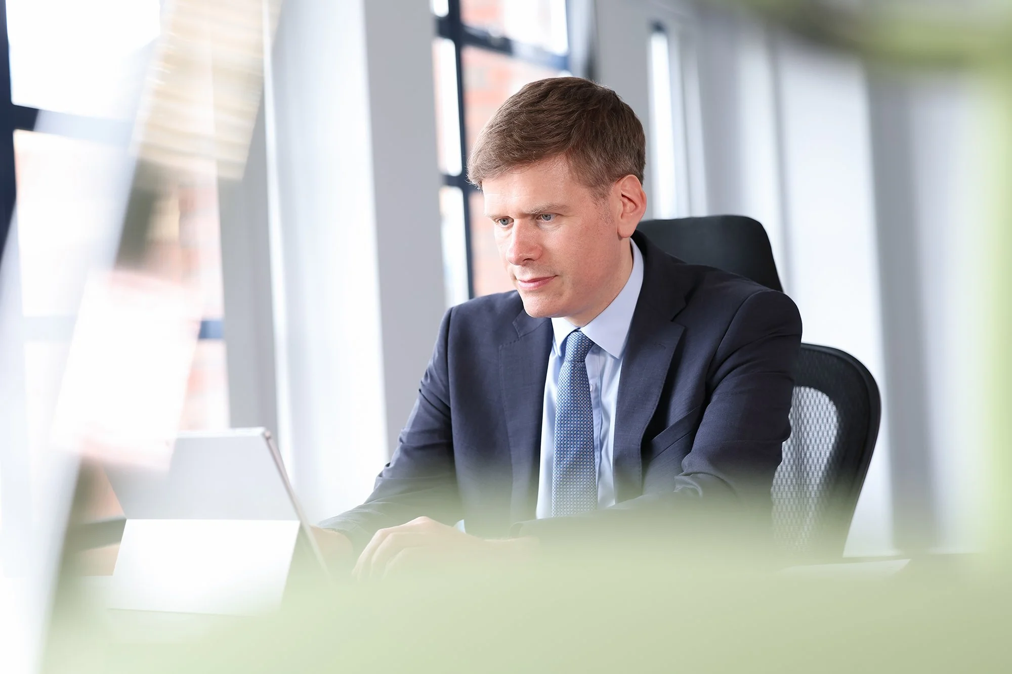 • Businessman in a suit working on a tablet at his desk in a bright office.